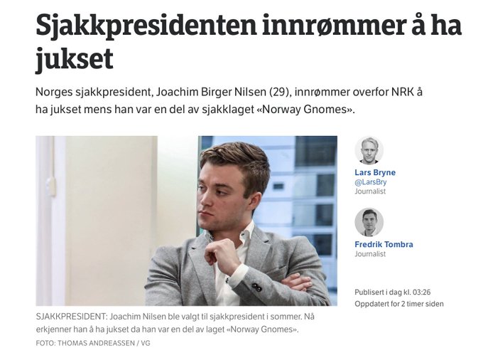 Sjakkforbundet skriver de tar. NRK avslöjade på torsdagen att Norska schackförbundets president Joachim Birger Nilsen 29 hade fuskat i Pro. 7 hours agoJoachim Birger Nilsen innrømmet torsdag å ha jukset i tre partier i 2016.